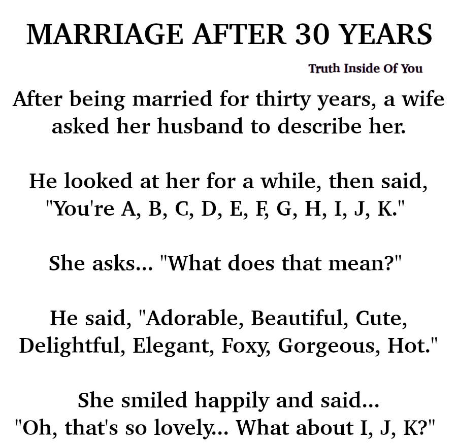 After thirty years of marriage, a wife asked her husband to describe her. “You are A, B, C, D, E, F, G, H, I, J, K,” he retorted. She inquired what it meant, and he responded, “Adorable, Beautiful, Cute, Delightful, Elegant, Foxy, Gorgeous, Hot.” After grinning, she inquired about I, J, and K. “I’m Just Kidding!” he said.